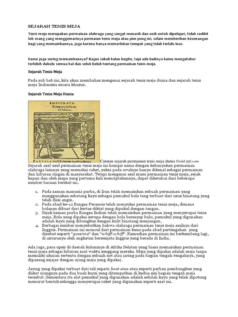 Tenis meja 2.2.1.1 sejarah tenis meja dunia permainan tenis meja atau table tennis mulanya dikenal sebagai hiburan ringan bagi masyarakat tetapi dari . Hasilnya, terbentuklah federasi tenis meja internasional (ittf) yang terdiri. Induk olahraga tenis meja di indonesia adalah ptmsi (persatuan tenis meja seluruh indonesia) dan di dunia adalah ittf (international table tennis . Permainan tenis meja merupakan bentuk adaptasi dari permainan tenis lapangan. Mulai dari ✓ pengertian, ✓ sejarah, ✓ teknik dasar, ✓ peralatan, dan ✓ manfaatnya.